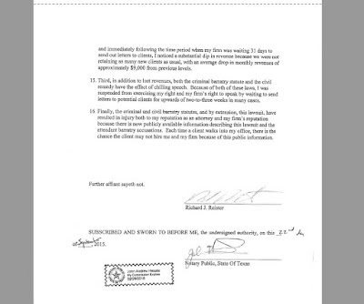 Reynolds is heading to county jail for one year for multiple violations of the 31-day blackout period, but another lawyer, up in Dallas, was not only not indicted (not to mention convicted), but sued the District Attorney (by third-party petition in a civil barratry case, see motion below) and got the DA enjoined from enforcing the barratry statute against him as unconstitutional.
